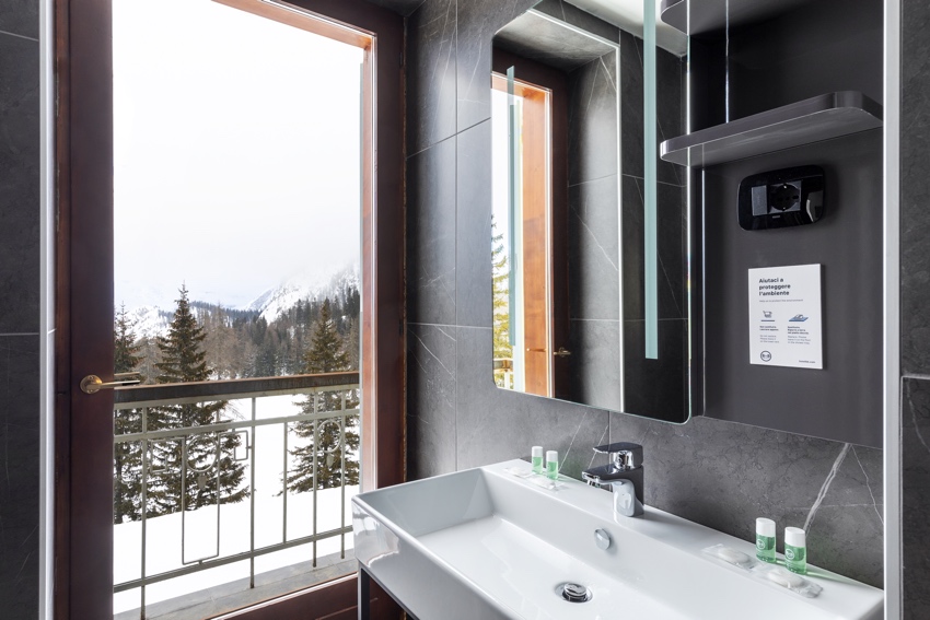 Tutte le camere dell’hotel hanno un design moderno e raffinato e quelle ai piani più alti offrono una vista mozzafiato sulle Dolomiti e la Valle d’Ampezzo.