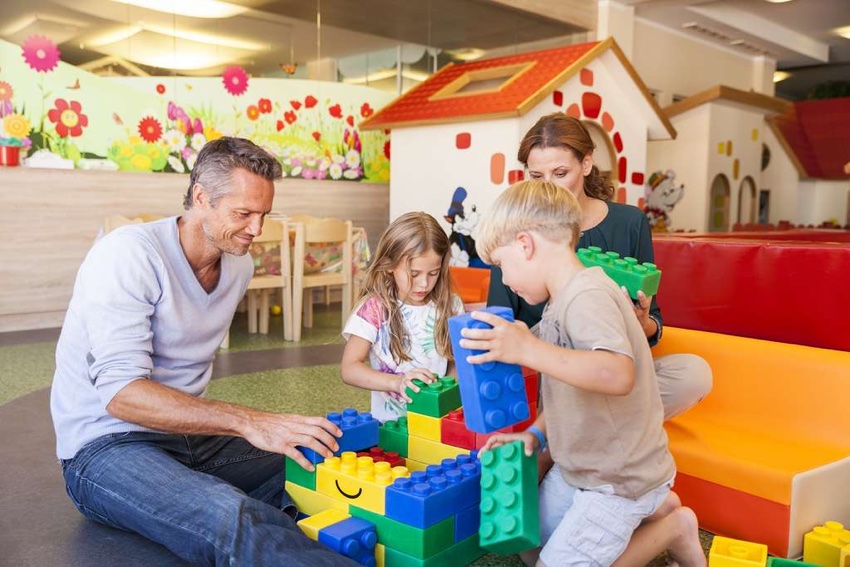 Nelle aree comuni ci sono naturalmente tantissimi giochi: dalla casetta di Heidi con cucinino e falegnameria al laboratorio per le arti creative, e poi ancora una grande casa delle bambole, la parete di arrampicata interattiva, la gaming room, il ping-pong, il mini-biliardo e, non ultimo, il ristorante per bambini.
