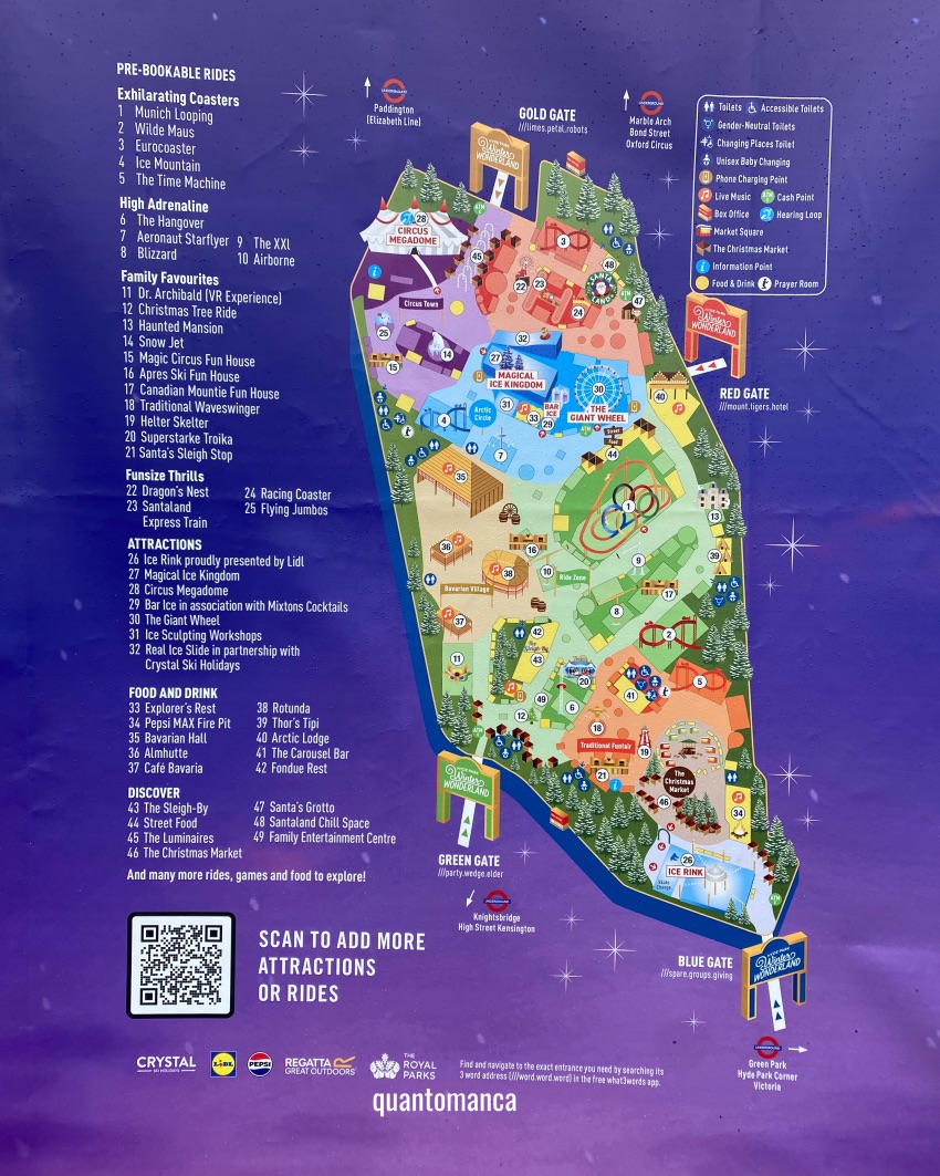 Il Winter Wonderland ha molteplici ingressi attorno a Hyde Park, quindi controllate la mappa sul sito ufficiale per pianificare quale stazione della metro porta più vicino alle attrazioni che volete visitare per prime.