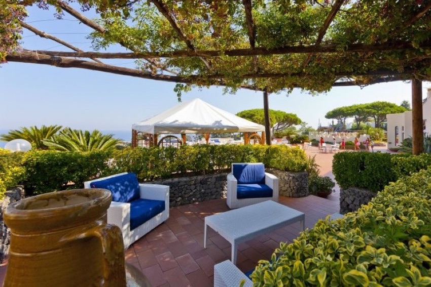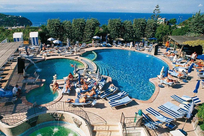 con una vista mare davvero mozzafiato. E’ un grande albergo di charme mediterraneo adatto per le vacanze in famiglia con bambini di qualsiasi eta con la beauty farm termale più bella dell’isola, 5 piscine interne ed esterne (anche intercomunicanti) con idromassaggi e cascate cervicali, 2 ristoranti, 2 bar, spiaggia privata, feste a tema e un mondo di servizi.